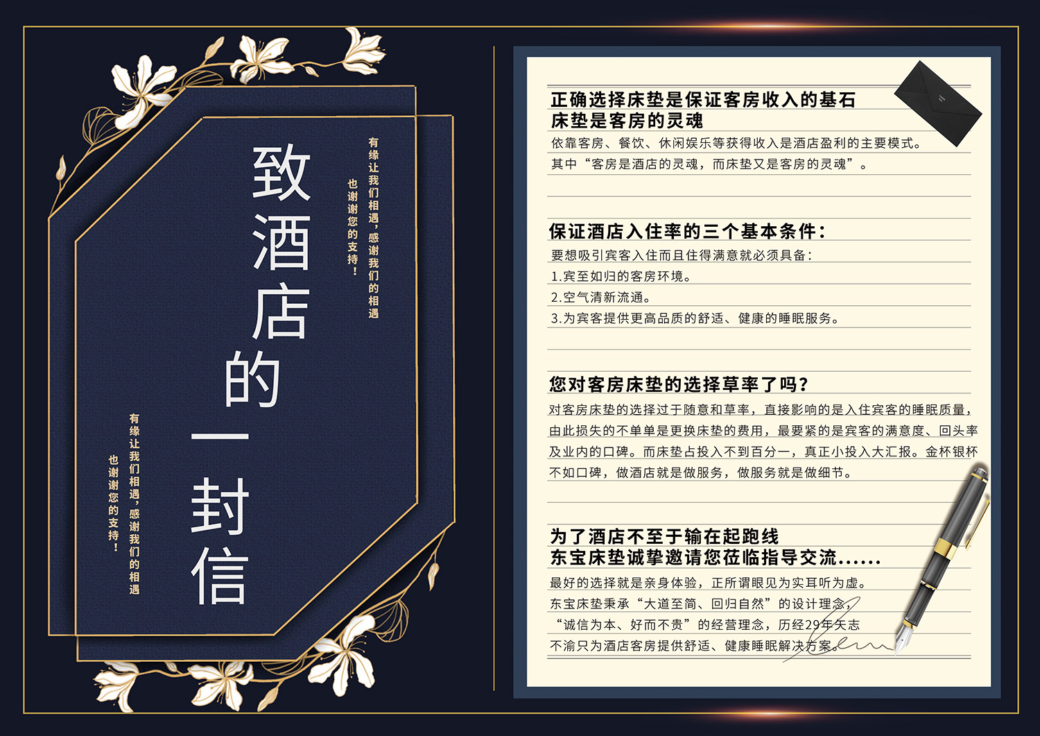 東寶床墊秉承“大道至簡(jiǎn)、回歸自然”的設(shè)計(jì)理念,“誠(chéng)信為本、好而不貴”的經(jīng)營(yíng)理念,歷經(jīng)29年矢志不渝只為酒店客房提供舒適、健康睡眠解決方案。